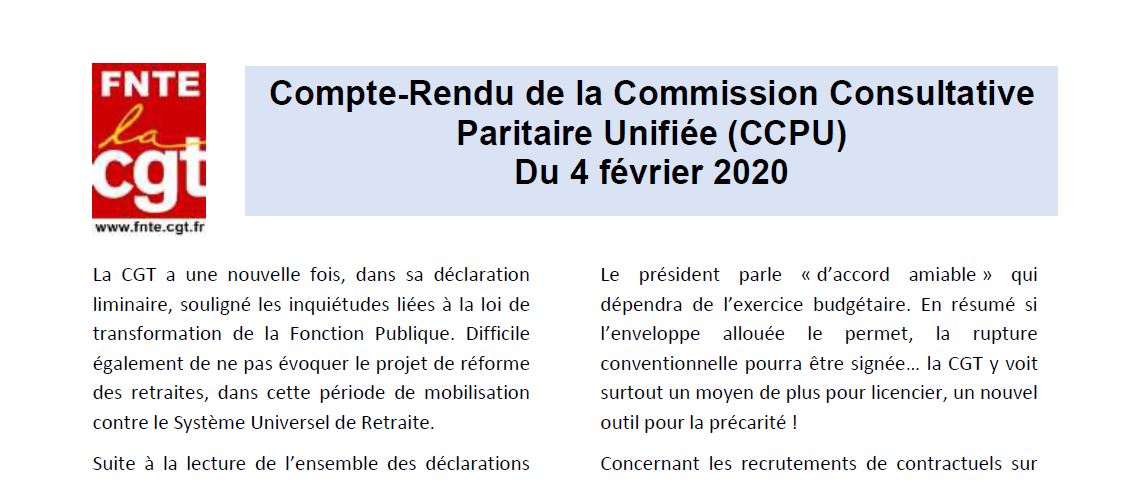 Compte-Rendu de la Commission Consultative Paritaire Unifiée (CCPU) Du 4 février 2020